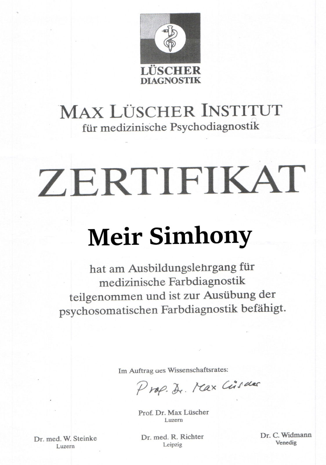 ר' מאיר שמחוני, מאבחן פסיכו-דיאגנוסטי מומחה שהוסמך ע"י מרכז לושר העולמי, שהלך ולמד את תורת האבחון ישירות מפרופ' לושר עצמו בשוויץ, וישב עמו ימים ארוכים, ואף תרגם את הספר של לושר וקיבל את הסכמתו האישית.
